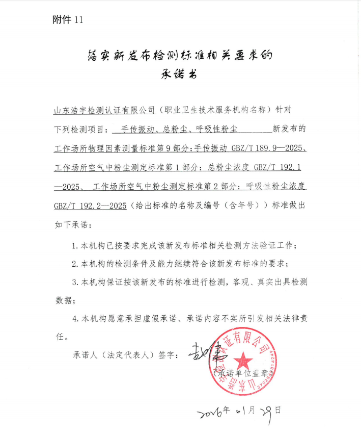 职业卫生技术服务:落实新发布检测标准相关要求的 承诺书-手传振动、总粉尘、呼吸性粉尘